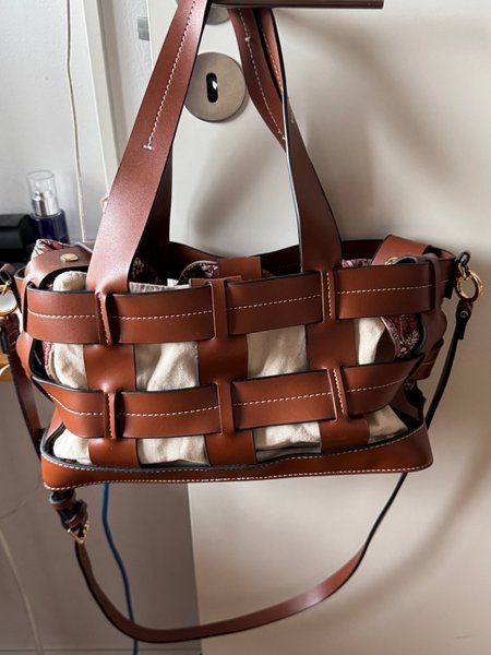 Brun handväska med breda axelband och ett justerbart, smalare axelband. Väskan har ett ljust innerfoder man kan ta ut