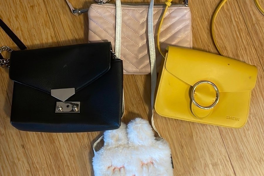 #reapåtradera Ett set med fyra olika väskor. Inkluderar en svart axelväska med silverfärgade detaljer, en ljusrosa kuvertväska med quiltat mönster, en gul axelväska från Shein med en stor ringdetalj, och en söt vit fluffig väska formad som en kanin.