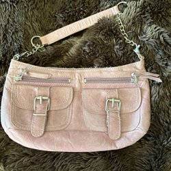 Handväska i en vacker rosa nyans. Väskan har ett stilrent spänne och kan bäras med handtag eller axelrem. Syntetmaterial. Oanvänd.