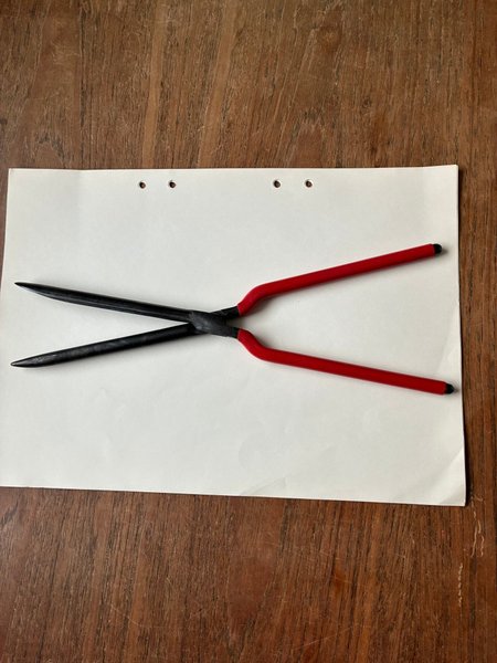 Verktyg för hårstyling. Har svarta metallstavar och röda handtag.