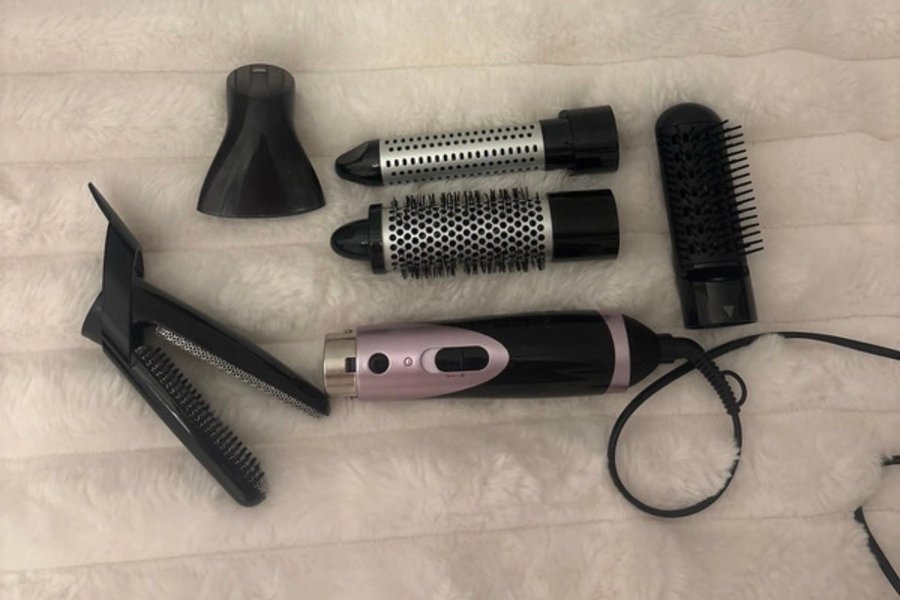 Multistyler för hår med flera tillbehör. Inkluderar en hårtork, två runda borstar i olika storlekar, en plattborste och ett munstycke.