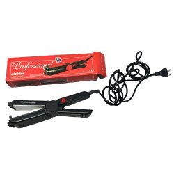 Plattång för hårstyling. Denna plattång har en svart design och är utrustad med plattor för att räta ut håret. Den har en integrerad kam på ena sidan för att underlätta stylingprocessen. Plattången har en standardkabel för anslutning till eluttag.