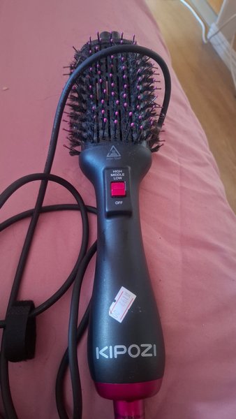 Värmeborste från KIPOZI. Borsten har tre värmeinställningar: hög, mellan och låg, samt ett av-läge. Den är utrustad med en sladd som kan fästas med ett kardborreband.