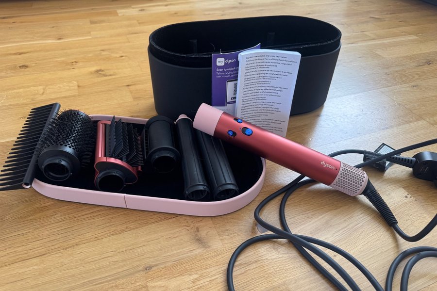 Dyson Airwrap Complete Long med flera tillbehör. Inkluderar en rosa och röd huvudenhet, flera borstar och stylingtillbehör, samt en förvaringsväska. Medföljer även instruktionsmanualer. Inköpt 2025 och sparsamt använd, flera tillbehör helt oanvända. Kvitto finns!
