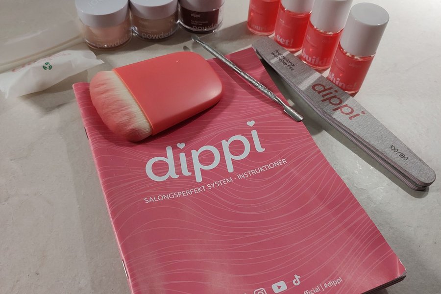 Komplett Dippi nagelkit för att skapa salongsnaglar hemma. Innehåller vätskor, puder, fil, borste och andra tillbehör för applicering. Använd endast två gånger.