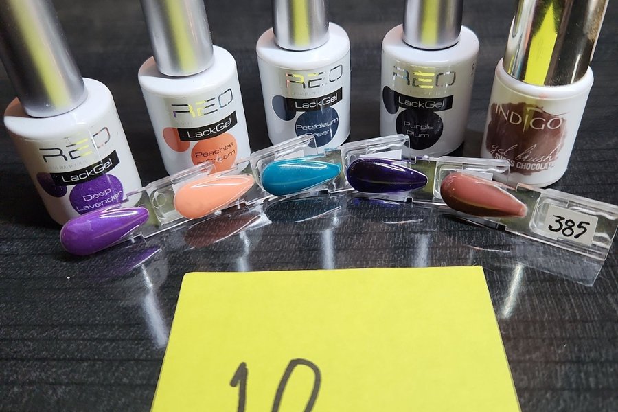 Ett set med olika Gellack från märkena REQ och Indigo. Färgerna inkluderar Deep Lavender, Peaches Cream, Petroleum Green, Purple Plum och Swiss Chocolate. Flaskorna är öppnade men flera är nästan fulla.