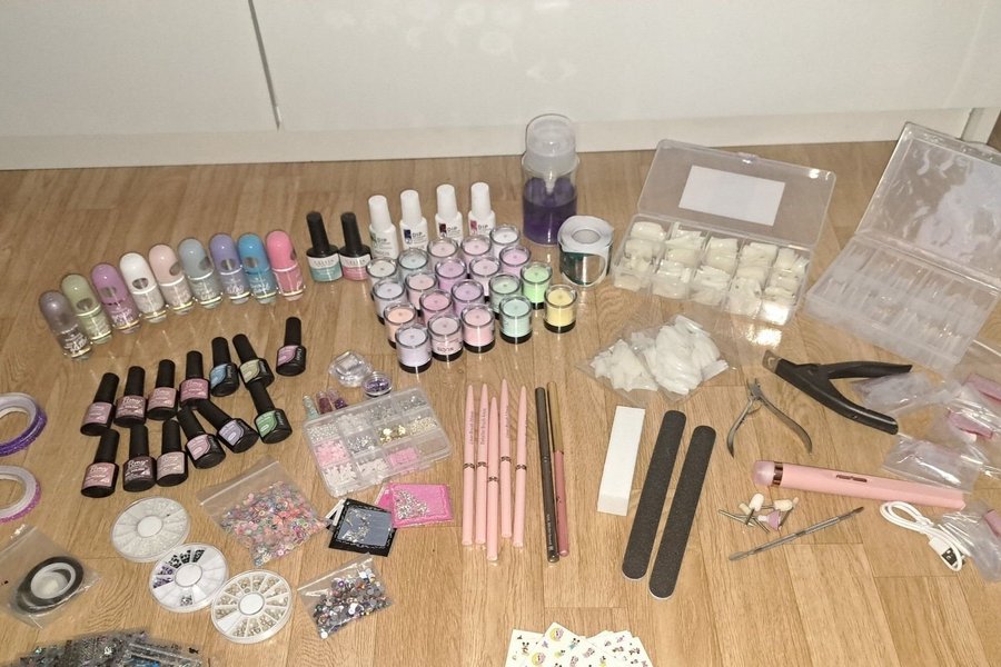 Stort nagelkit med nagellack, dekorationer, penslar, tippar,akryl,verktyg mm
