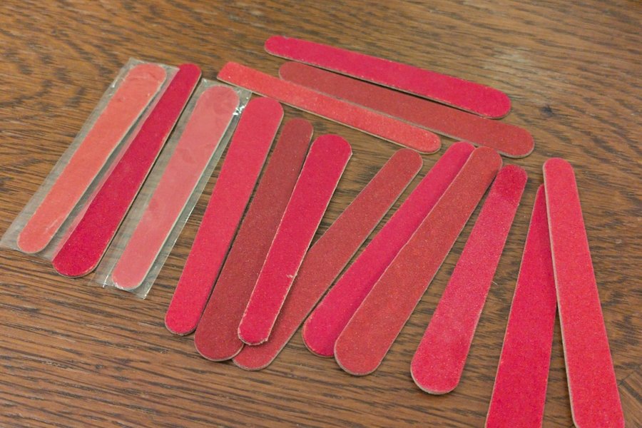 Detta är ett 15-pack nagelfilar i rött. Några filar är individuellt förpackade i plast.