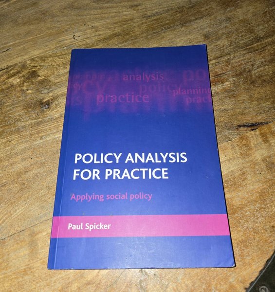 Boken Policy Analysis for Practice av Paul Spicker utforskar tillämpningen av socialpolitik. ISBN saknas i bilden.