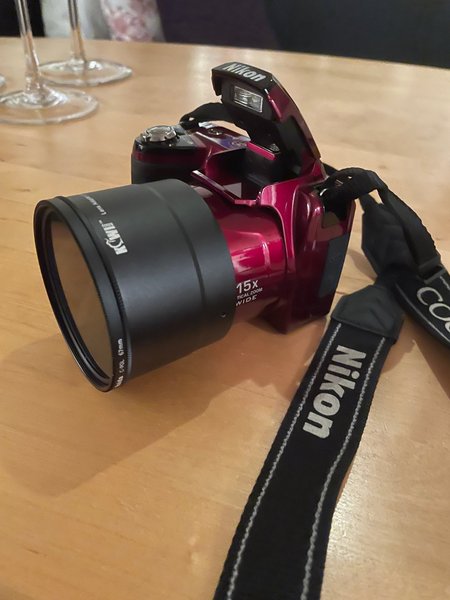 Kamera med 15x optisk zoom och ett objektiv med 67mm filterdiameter. Kamerarem medföljer.