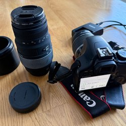 Canon eos 1000D kamera med två objektiv. Ett EF 50mm 1:1.8 och ett EFS 18-55mm. Instruktionsböcker, Extra batterier, laddare samt kameraväska medföljer.