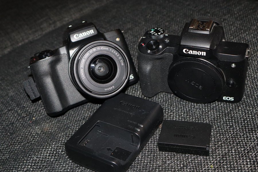 2 Stcken Systemkamera från Canon. Kameran har ett Canon Zoom Lens EF-M 15-45mm 1:3.5-6.3 IS STM objektiv med en diameter på 49mm. En Canon batteriladdare och ett Canon batteri medföljer.