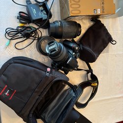 Svart Nikon systemkamera med objektiv. Kameran har en rem för enkel hantering. Hama stativ medföljer.