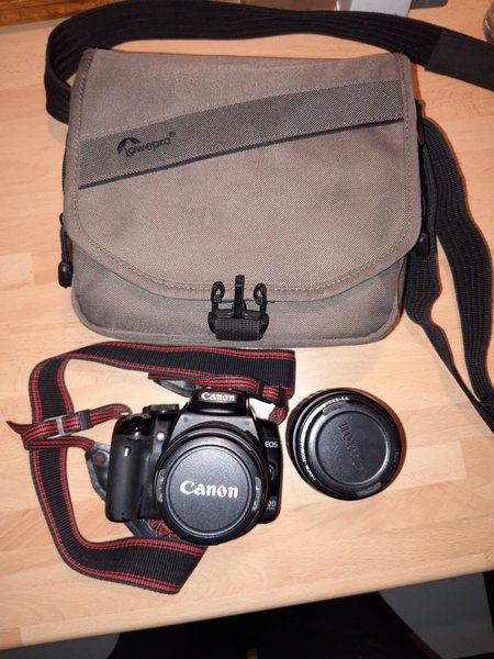 Systemkamera från Canon i modellen EOS Digital. Kameran kommer med ett objektiv. Kameran har en rem för enkel transport.