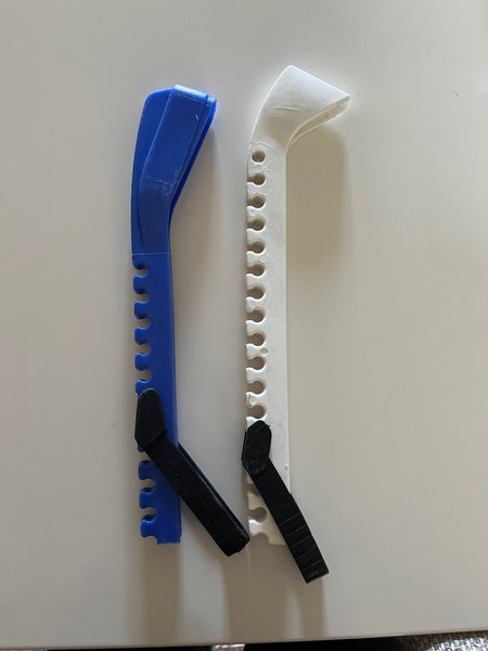 Två par skridskoskydd i plast. Ett är blått och ett är vitt. Skydden är justerbara och har svarta spännen.