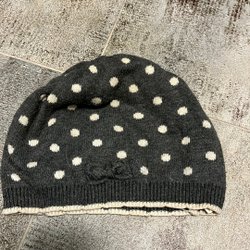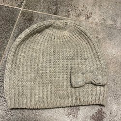 Grå mössa med ett sött kaninmotiv. Mössan har kaninöron upptill och en liten fluffig svans baktill. Observera att det finns ett litet hål på sidan av mössan.