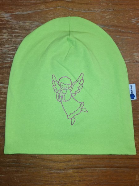 En söt, limegrön mössa med en lila ängel tryckt på framsidan. Mössan är enkel i modellen och har en etikett från M&N Design. Samma jersey är som foder i mössan. Tvättas i 40 grader. Storlek 50/52.