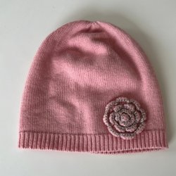 En rosa mössa med en knut på toppen. Mössan är mjuk och bekväm att bära.