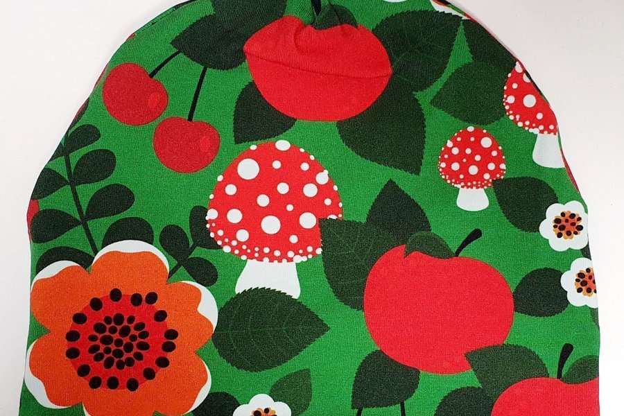 Mössa, passar barn ca 3-8 år. Omkrets ca 48 cm, töjer sig flera cm. Mät huvudet för säkerhets skull.