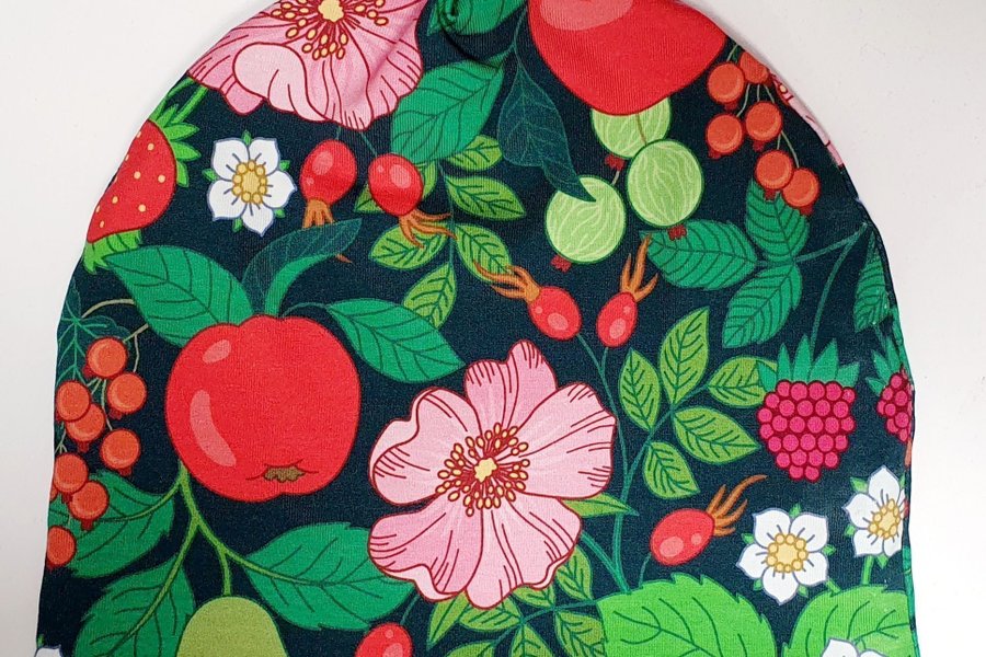 Mössa, passar barn ca 3-8 år. Omkrets ca 48 cm, töjer sig flera cm. Mät huvudet för säkerhets skull.