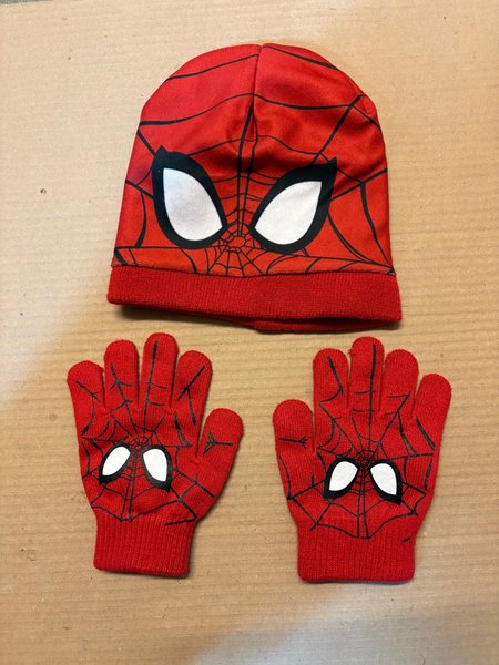 Röd mössa och vantar med Spiderman-motiv. Mössan har en design som liknar Spidermans mask med vita ögon och svarta nätlinjer. Vantarna matchar mössan med samma Spiderman-design.