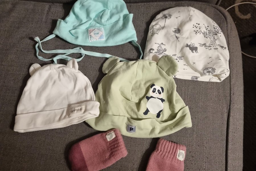 Söt bebisuppsättning med mössor och tumvantar! Mössorna är i olika söta mönster och färger, perfekta för att hålla bebisen varm, 3 st 0- 1 månad och den med Panda 4-6 månad