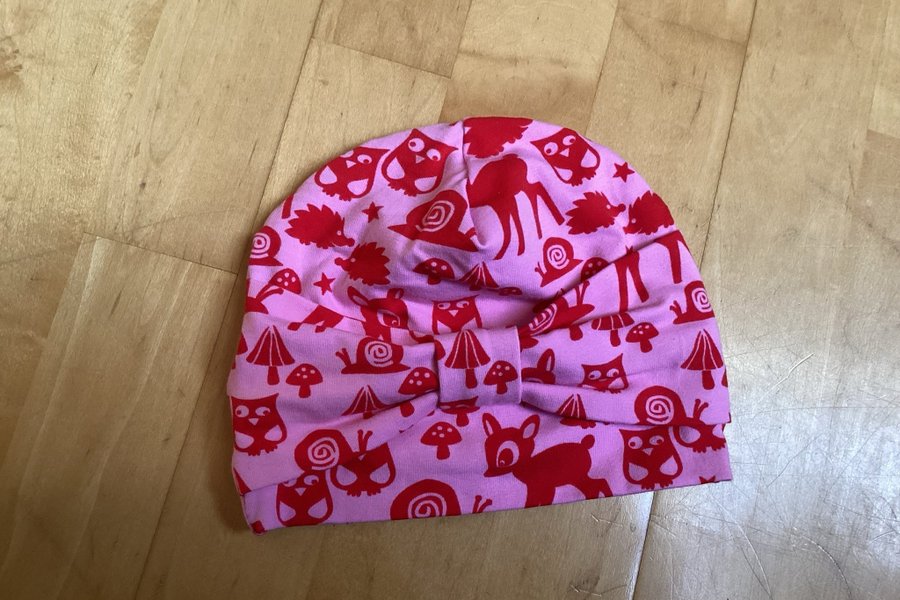 Söt mössa i ljusrosa med rött tryck av skogsdjur, svampar och sniglar. Mössan har en dekorativ rosett framtill. Huvudvridning: 44 cm.