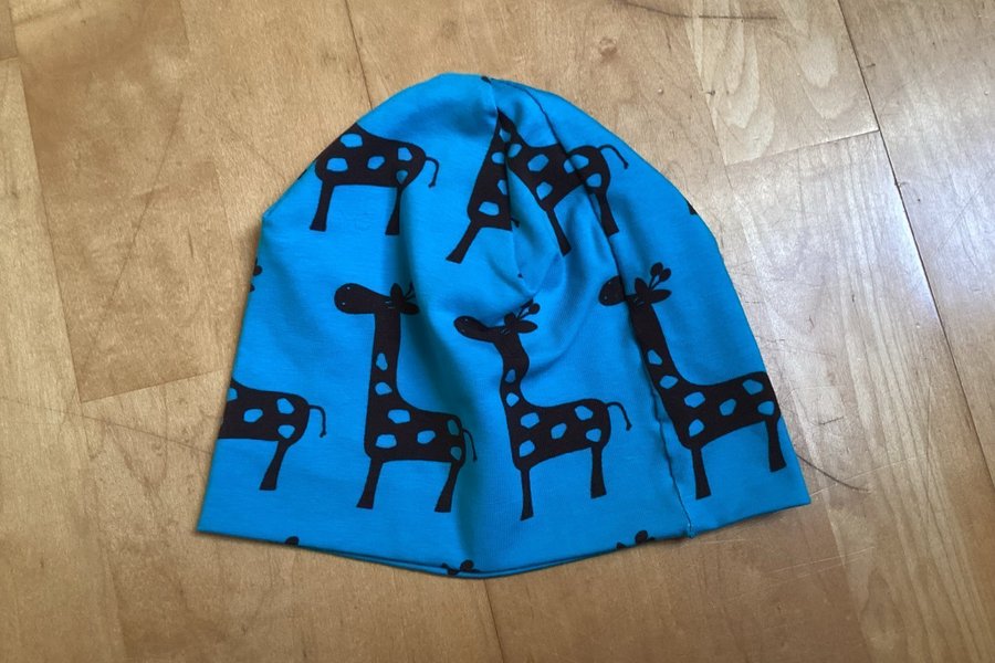En söt, turkosfärgad mössa med ett mönster av bruna giraffer. Perfekt för barn som älskar djur och lek. Huvudvridning: 46 cm