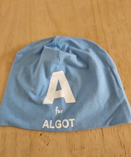 Blå mössa med texten "A for ALGOT" i vitt tryck på framsidan. Mössan är enfärgad och har en klassisk passform.