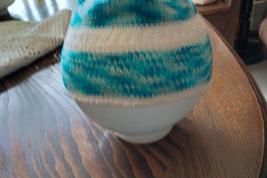 En virkad mössa med ett mönster av vita och turkosa ränder. Mössan har en rundad topp och en kant i en ljusare nyans.