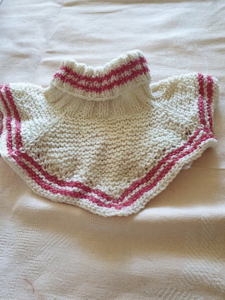 Här är en söt, handstickad halsvärmare i creme med rosa ränder. Den har en hög krage och är stickad i ett fint mönster. omkrets 38 cm.