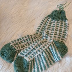 Ett par handstickade, röda sockor med melerade detaljer i lila och andra färger. Sockorna har en ribbstickad mudd.