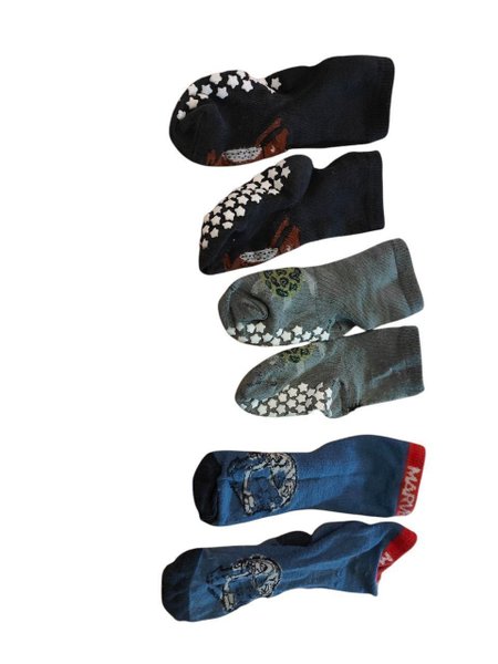 Ett set med sex stycken barnstrumpor i olika färger och mönster. Det finns två svarta strumpor med vita stjärnor, två gråa strumpor med vita stjärnor och två blåa strumpor med tryck.