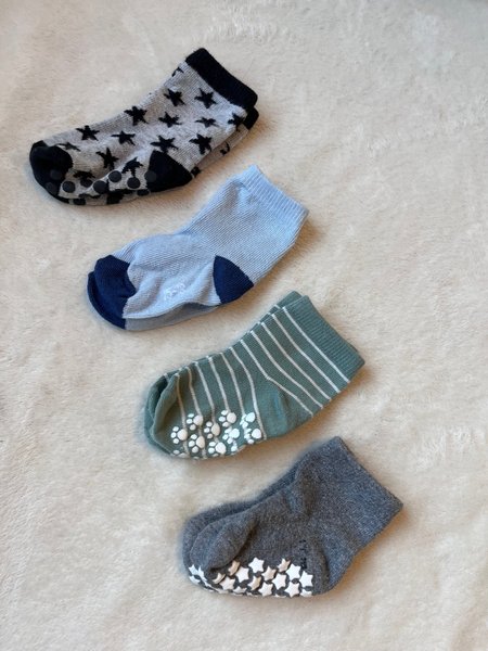 Fyra par halksockor i olika färger och mönster. Ett par är grå med svarta stjärnor och svarta halkprickar. Ett par är ljusblå med mörkblå detaljer (ej halksockor dock!) Ett par är gröna med vita ränder och vita halkmönster som liknar tassar. Ett par är mörkgrå med vita stjärnformade halkmönster.