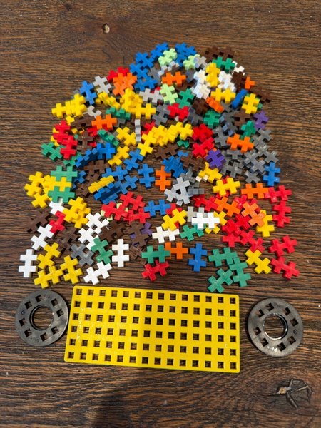 Ett set med Plus-Plus bitar i olika färger, en gul platta och två hjul.