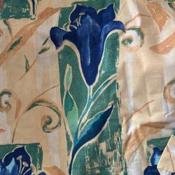 Retro gardiner med ett abstrakt mönster i gult, orange och brunt. Observera att det finns slitage.