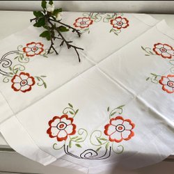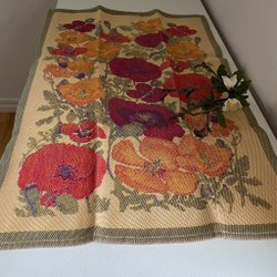 Med rosa botten och ett mönster i röd/orange ton är detta fina vadderade täcke