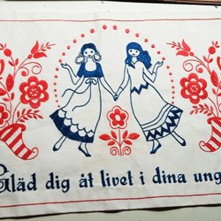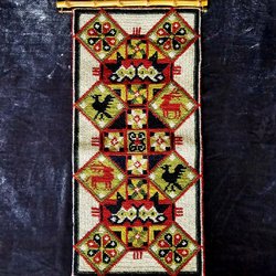 Handvävd och handbroderad äldre väggbonad/rana. 46x84 cm. Ull. Metallbeslag för upphängning ingår.