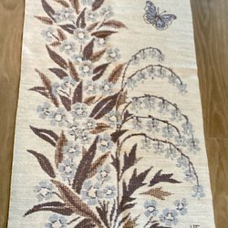 En charmig retro väggbonad med ett vackert blommönster. Bonaden har en dekorativ upphängning i bambu och kedja, vilket ger den en unik och tidstypisk känsla. Perfekt för att addera en vintage touch till ditt hem. 29 x 91 cm. En skruv saknas på ena sidan av upphängningen. Annars inga fel att hitta. Fantastiskt fina färger.