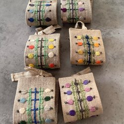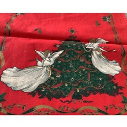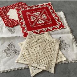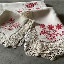 Handbroderier på linne med text, kantad med bomullsband