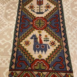 Vacker broderad väggbonad i korsstygn på vit botten och med vit rundstav
