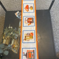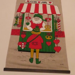 En retro väggbonad med ett färgglatt motiv. Den har en upphängningsanordning i trä.