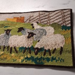En väggbonad med motiv av får och ett tält. Baksidan är täckt med papper.