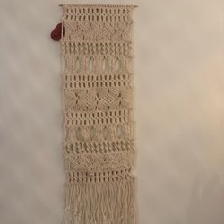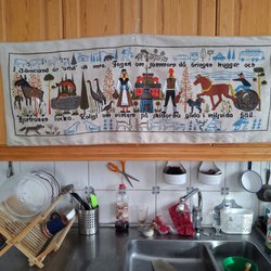 Väggbonad med motiv av Albert Einstein som räcker ut tungan. Bonaden är svartvit med texten ”Albert” i blått. Mått: ca 104 cm lång och ca 72cm bred.