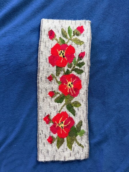 Vävd väggbonad i mycket fint skick förställande röda rosor. Bonaden har måtten 43x16 cm