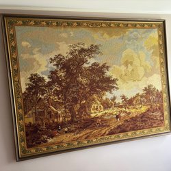 Dekorativ väggbonad med motiv av en känd byggnad i Dubai och palmer. Den har en detaljerad broderad design med en dekorativ kant. Tyget är silkes/sammet. Knappt använd och väldigt bra skick. Hör av dig vid intresse!