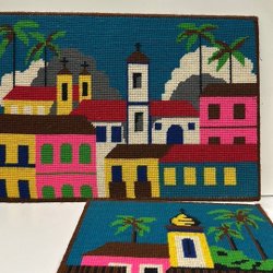 Väggbonad i bambu med motiv sytt med silkestråd och vissa delar målade. Väldigt ovanlig jag har haft den i över 40 år.