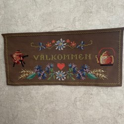 Mycket gammal väggbonad handvävd och sydd text”Och jag skall väva mig en randig skjortklänning en randig sjortel så komma friare från alla orter från alla orter