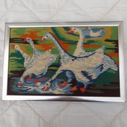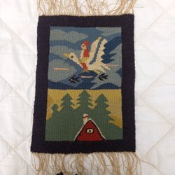 En fin broderad bonad i jugend-stil med texten" jorden är härlig och skön,fåglarna små det förstå,de flyga på lätta vingar,upp mot himmelen blå" I fint skick, ofärgat linne, broderat med plattsöm och pärlgarn,ca88x40 cm,