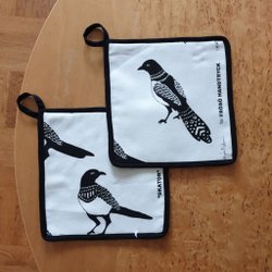 2 stycken grytlappar FJÄLL design Emelie Ek tryckt på Fröso Handtryck.